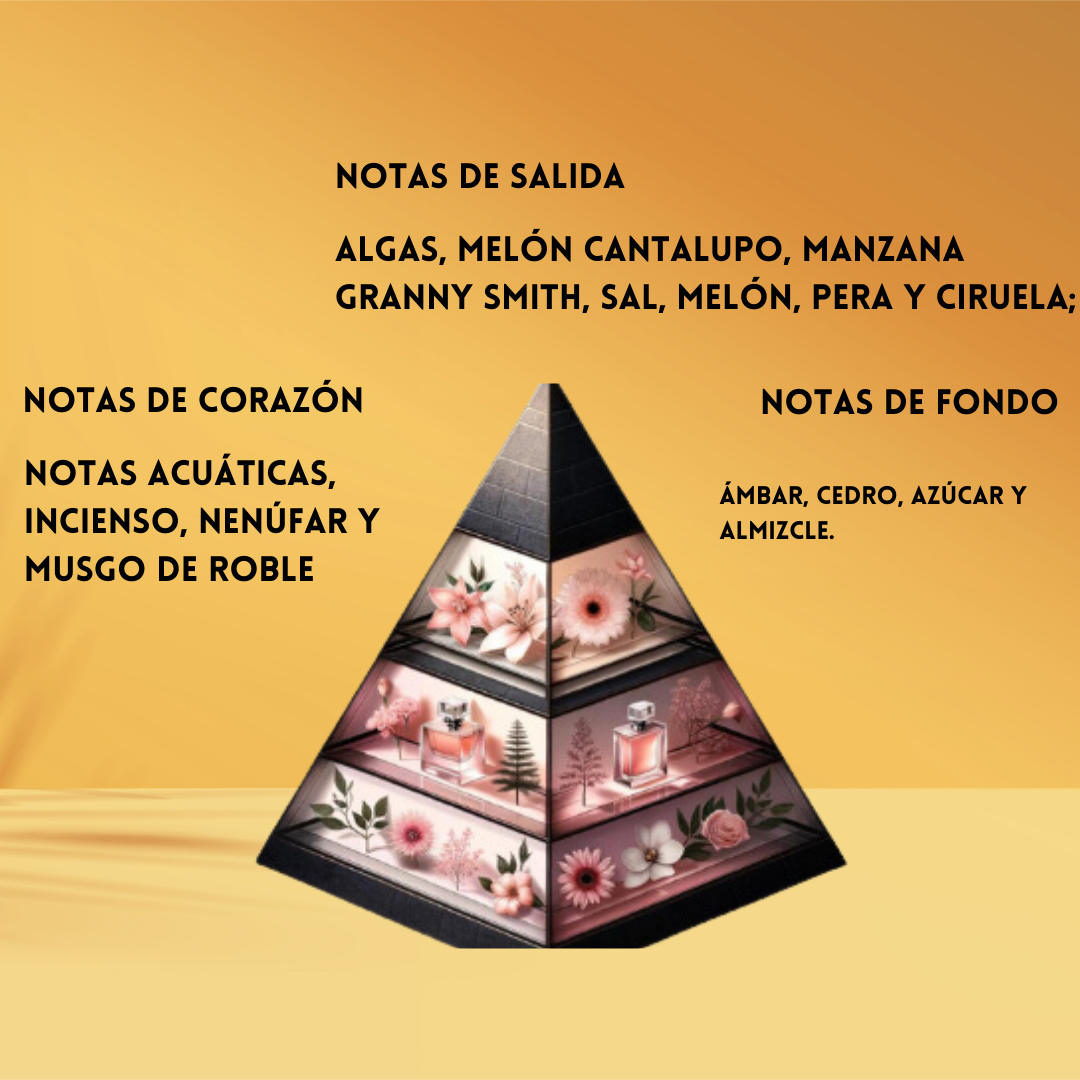 🌊 Corazón marino & sofisticado: Notas Acuáticas, Incienso místico, Nenúfar delicado y Musgo de Roble verde.