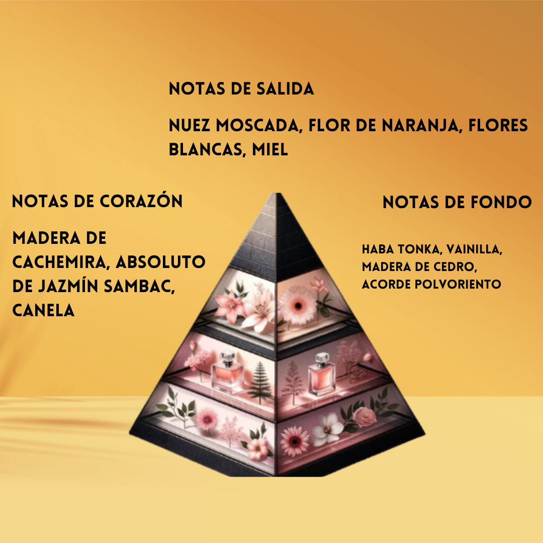 🌶️ Salida cálida & especiada: Nuez Moscada aromática, Flor de Naranja, Flores Blancas y Miel dorada.