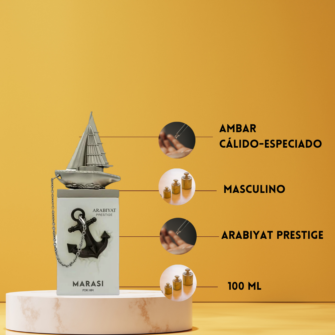 Marasi For Him de Arabiyat Prestige Eau de Parfum Hombre (2026) es una fragancia oriental especiada creada por el perfumista Mustafa Firoz, pensada para el hombre que busca intensidad, elegancia y profundidad aromática. La apertura combina la frescura cítrica de la mandarina con la sofisticación de la lavanda y el toque floral refinado del jazmín sambac, creando un inicio luminoso pero distinguido. En el corazón, la fragancia evoluciona hacia un perfil más cálido y místico con canela, incienso de olíbano, nuez moscada y raíz de lirio, aportando carácter especiado y elegancia clásica. El fondo se asienta sobre una base oriental profunda de pachulí, estragón, ládano y benjuí, dejando una estela resinosa, envolvente y masculina. Marasi For Him es ideal para la noche, eventos formales o para hombres que desean un perfume sofisticado y memorable.