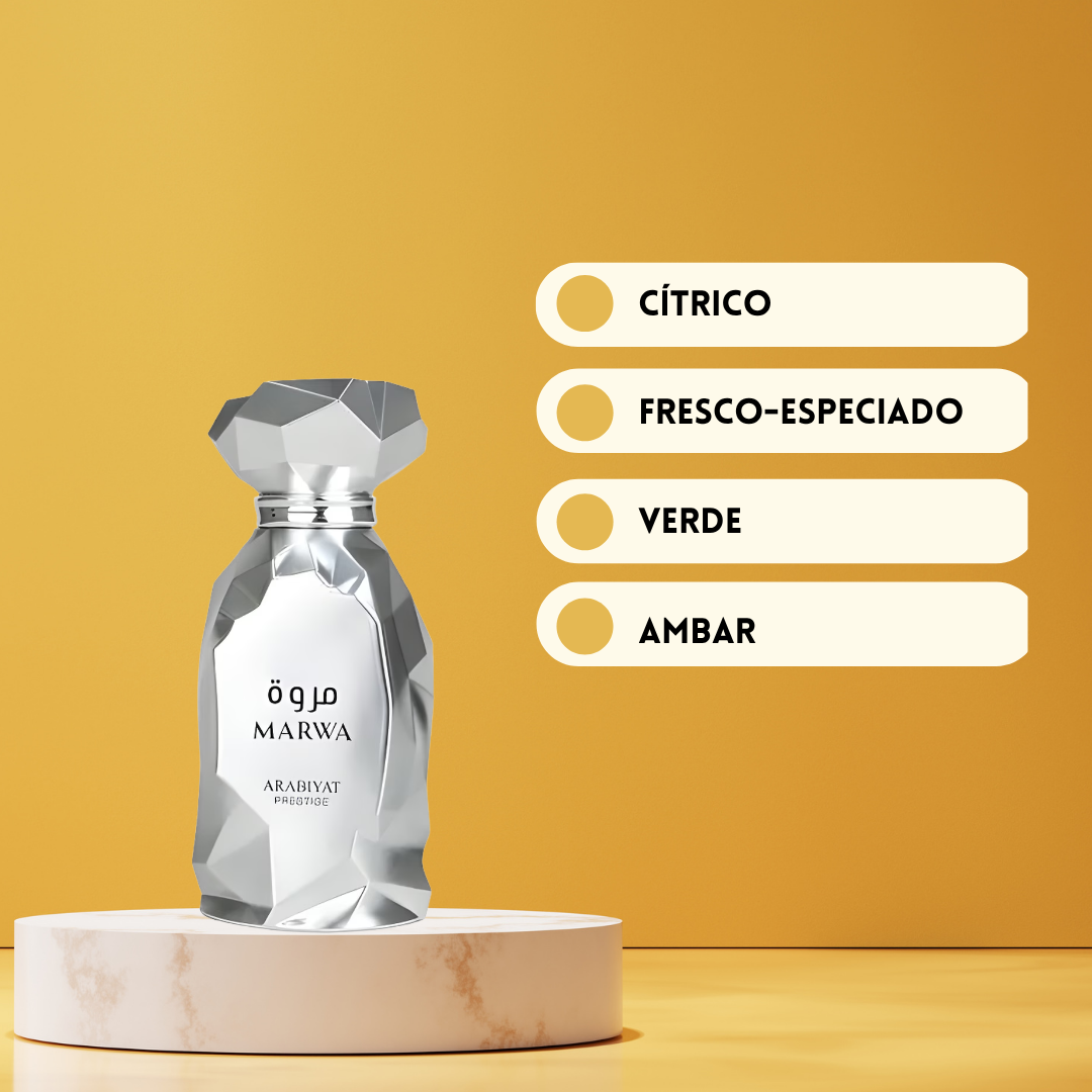 Arabiyat Prestige Marwa es más que un perfume: es una experiencia olfativa que ilumina, seduce y deja huella. Desde su apertura fresca y vibrante hasta su estela especiada y balsámica, encarna una elegancia atemporal con un toque moderno y magnético. Déjate conquistar por su aura y haz que tu fragancia sea tu declaración personal.