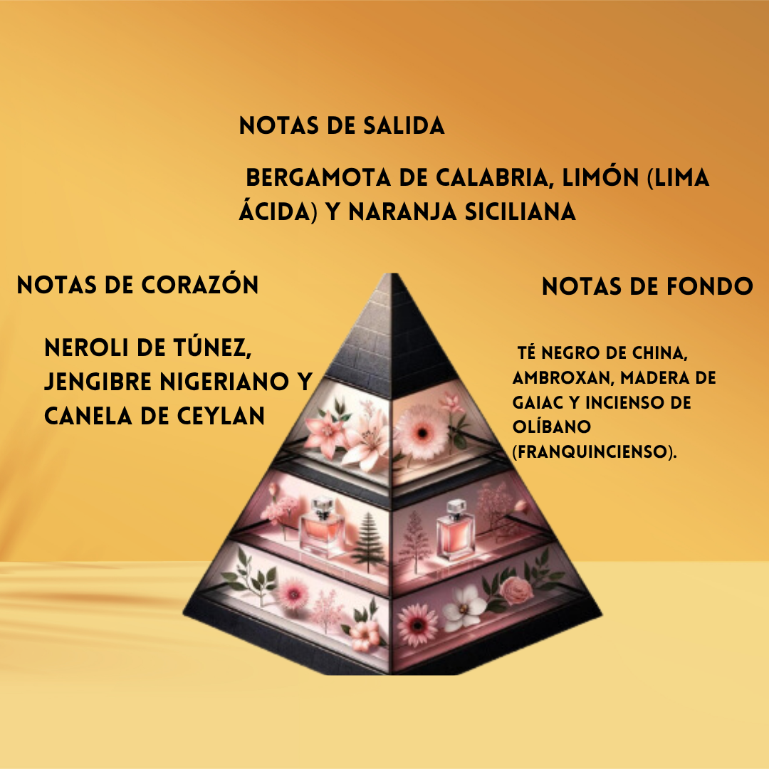 Notas de Corazón: Neroli Tunecino, Jengibre Nigeriano, Canela de Ceilán
