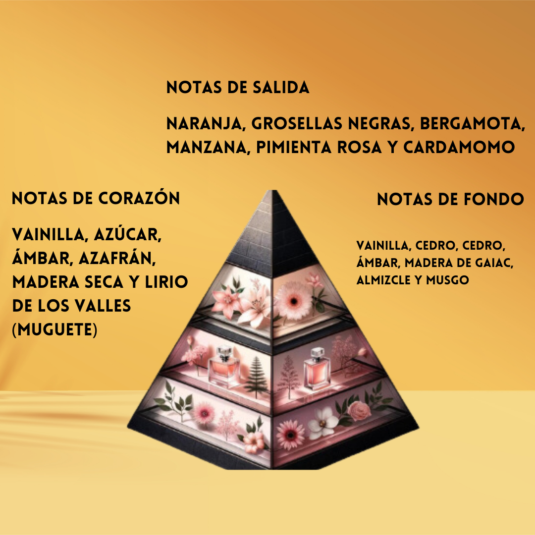 🌸 Corazón dulce & floral: Ámbar, Azúcar de Caramelo, Lirio de los Valles, Azafrán, Maderas Secas y Vainilla aportan calidez y sofisticación.