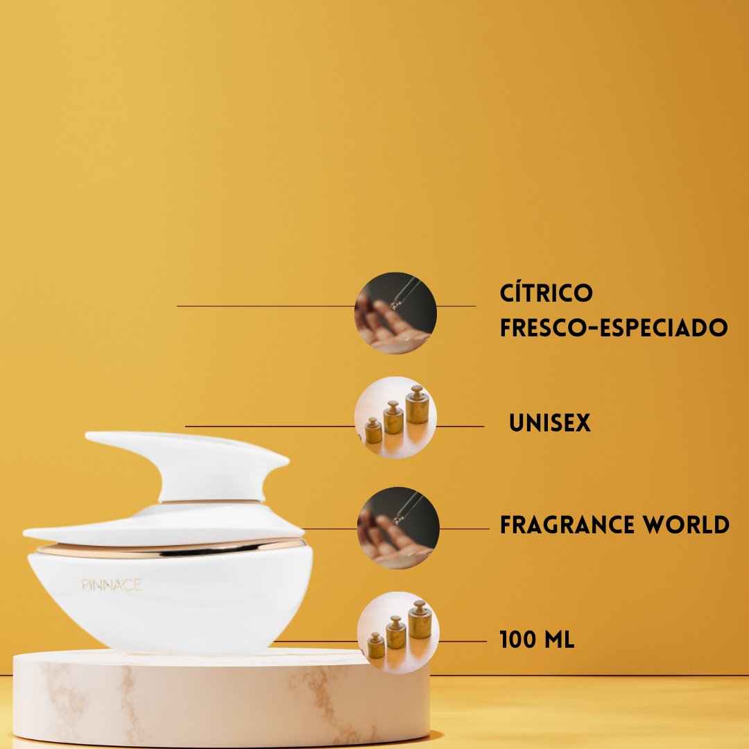 Pinnace de Fragrance World es un Eau de Parfum de 100 ml que redefine el frescor con un carácter distintivo y sofisticado. Esta fragancia unisex combina la vitalidad de los cítricos con un corazón mentolado y un fondo suave que deja una impresión inolvidable.