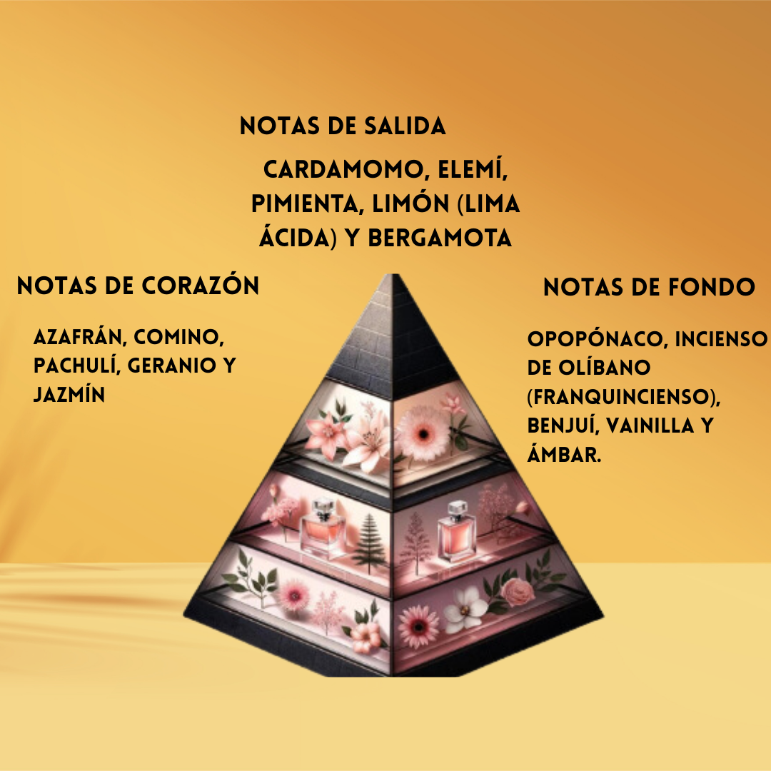 🔥 Corazón cálido & exótico: Azafrán lujoso, Comino especiado, Pachulí profundo, Geranio y Jazmín elegantes.