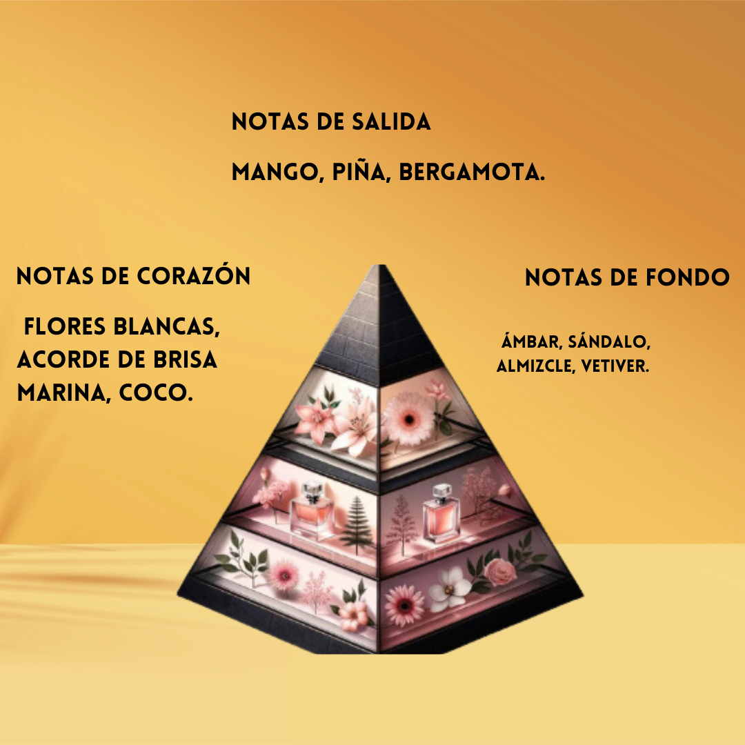 🥭 Salida jugosa & chispeante: Mango maduro, Piña exótica y Bergamota cítrica iluminan el inicio.