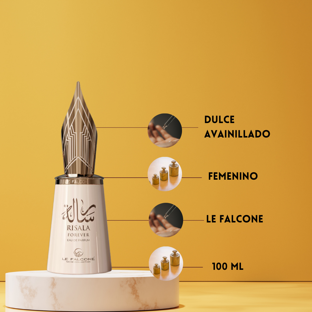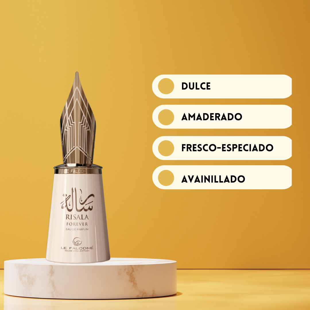 Risala Forever de Le Falconé Perfumes Eau de Parfum Unisex (2025) es una fragancia oriental vainilla diseñada para quienes aman los aromas gourmand profundos y reconfortantes. La apertura combina el toque especiado del jengibre con la dulzura cremosa de la crema de mantequilla, el caramelo y la canela, creando una sensación cálida y adictiva desde el primer instante. En el corazón, el perfume evoluciona hacia un acorde intensamente goloso de jarabe, arce, mantequilla y galleta, evocando el aroma de un postre recién horneado. El fondo despliega una base rica y duradera de coco, vainilla, azúcar, almizcle y azúcar quemado, aportando profundidad, sensualidad y una estela envolvente. Risala Forever es ideal para hombres y mujeres que buscan un perfume dulce, intenso y memorable, perfecto para climas frescos y ocasiones especiales.