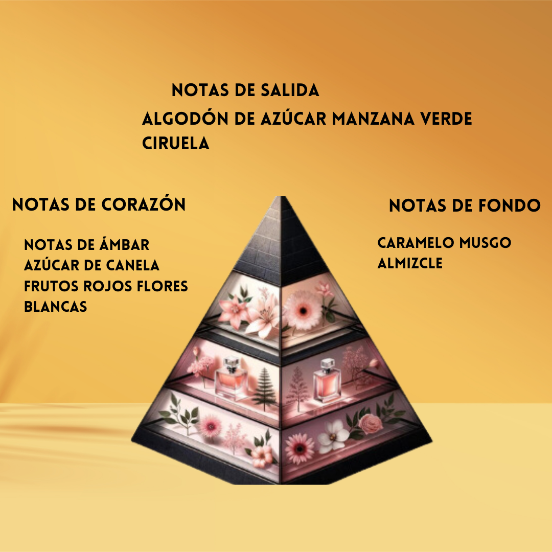 🍬 Corazón cálido & goloso: Canela especiada, Azúcar dulce, Frutos rojos, Flores blancas y Ámbar dorado.