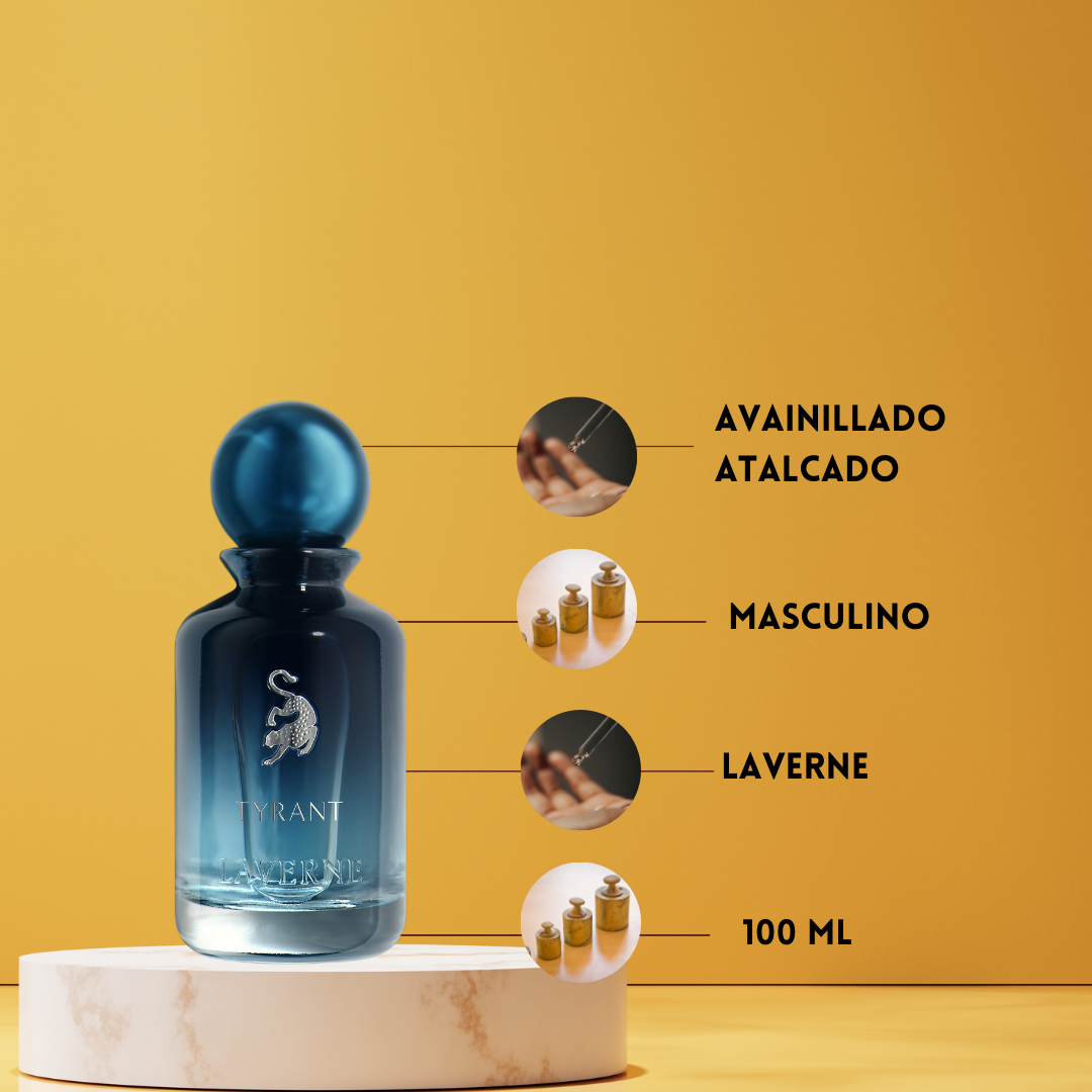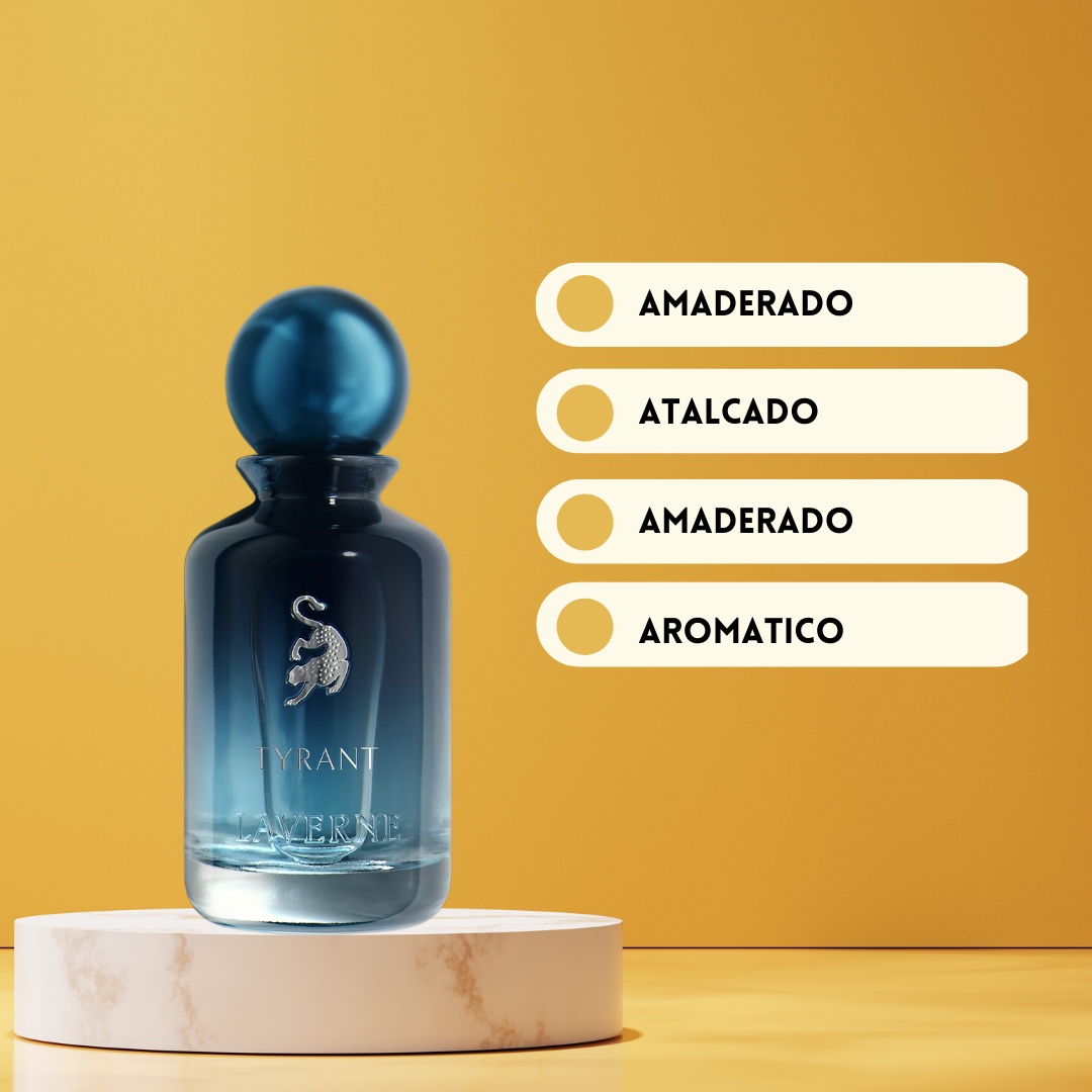 Tyrant de Laverne Eau de Parfum Unisex (2023) es una fragancia oriental amaderada que combina frescura aromática con una base cálida y sofisticada. Su apertura destaca por la mezcla refinada de lavanda, bergamota y hojas de ciprés, aportando un inicio limpio, verde y elegante. En el corazón, el sándalo cremoso se entrelaza con el jazmín, creando un equilibrio perfecto entre profundidad amaderada y suavidad floral. El fondo revela una base cálida y envolvente de vainilla, ámbar y vetiver, dejando una estela sensual, estructurada y duradera. Tyrant es ideal para hombres y mujeres que buscan un perfume versátil, moderno y con carácter, perfecto tanto para el uso diario como para ocasiones especiales.